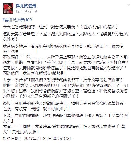 一名網友在「靠北旅遊業」臉書PO文,在香港轉機時,看到一對穿著華麗的台灣夫婦,但奇怪的是炎炎夏日,婦人卻穿著密不通風的風衣,讓他好生狐疑,過安檢時,眼尖的航警要求婦人脫下外套檢查,她當場面有難色,脫下風衣後,大肚子馬上現形,因