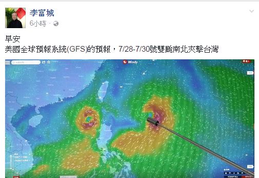 李富城根據美國全球預報系統(GFS)分析,周五到周日恐怕會有雙颱南北夾擊台灣。目前南海至菲律賓東方海面利於熱帶系統發展,菲律賓東方熱帶擾動「最快」今天就有可能發展成第9號颱風尼莎。