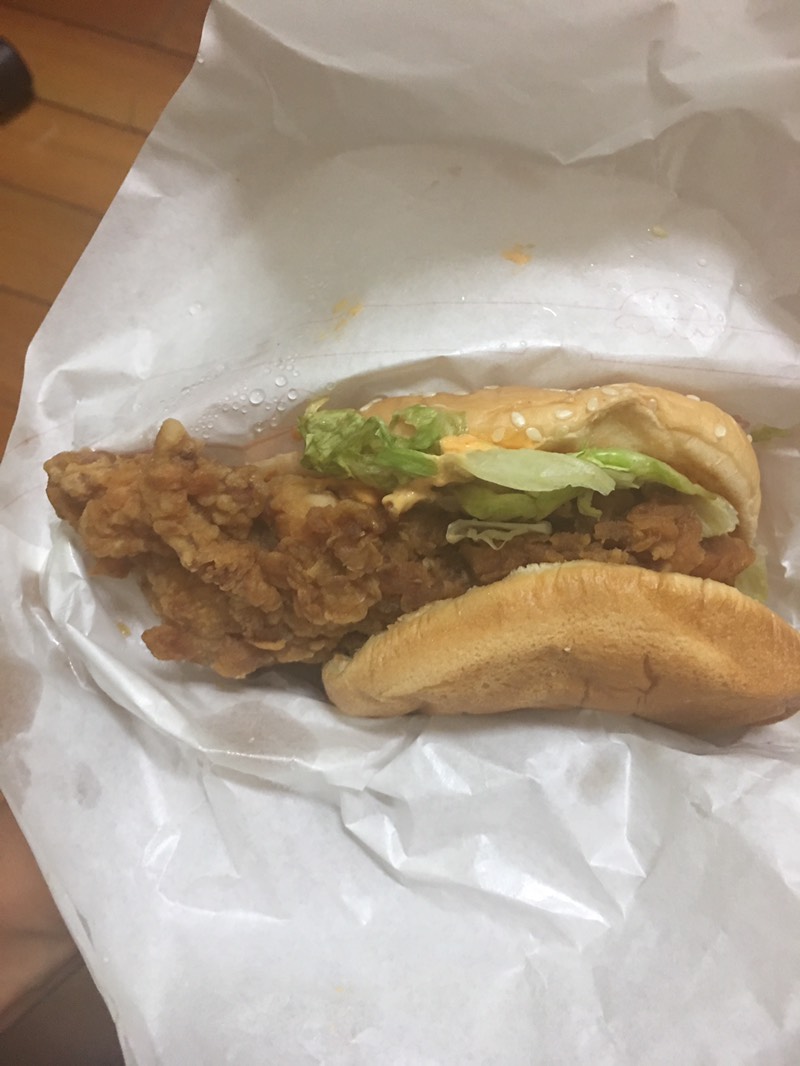 雞腿堡,但拿回家後,卻發覺雞腿堡莫名的凸了一塊,原PO於是疑惑的打開包裝,竟發現整隻雞腿突出,根本比漢堡皮還要大,讓他不禁困惑「我到底吃的是漢堡還是雞腿?」,直呼「真的是太扯了!」