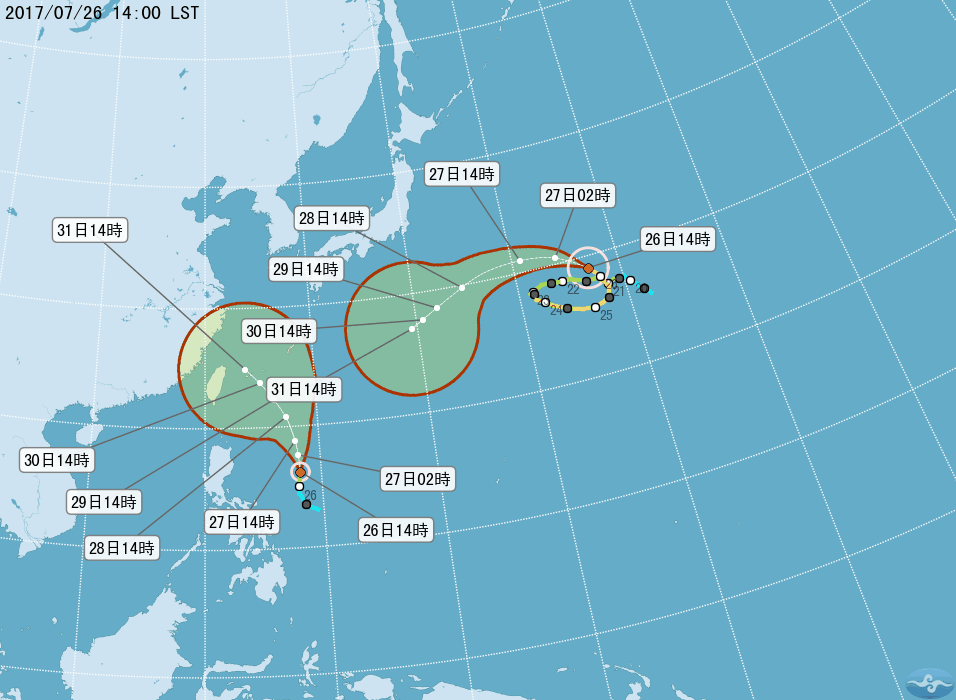 氣象局指出,輕颱尼莎目前以每小時12公里向北前進,七級暴風半徑80公里,周末至下周二都可能影響台灣。值得注意的是,中央氣象局預報員顏增璽表示,尼莎的路徑偏向台灣的機率高,在明後兩天會較明朗,28日(周五)將是轉向的關鍵,因目前太平洋高壓減弱趨勢不如預期,偏向台灣機率高,29日(周六)發布海警機率大增,不排除陸警也將會發布。