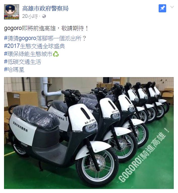高雄市政府警察局PO出照片表示「Gogoro即將前進高雄,敬請期待!」只見一台一台的Gogoro排排站,全部都已經換成黑白配色的車底,側面和車頭還印有黑字「高雄市政府警察局」的警用塗裝,粉專的小編還要大家猜猜「Gogoro落腳哪一個派出所?」成功吸引網友目光。