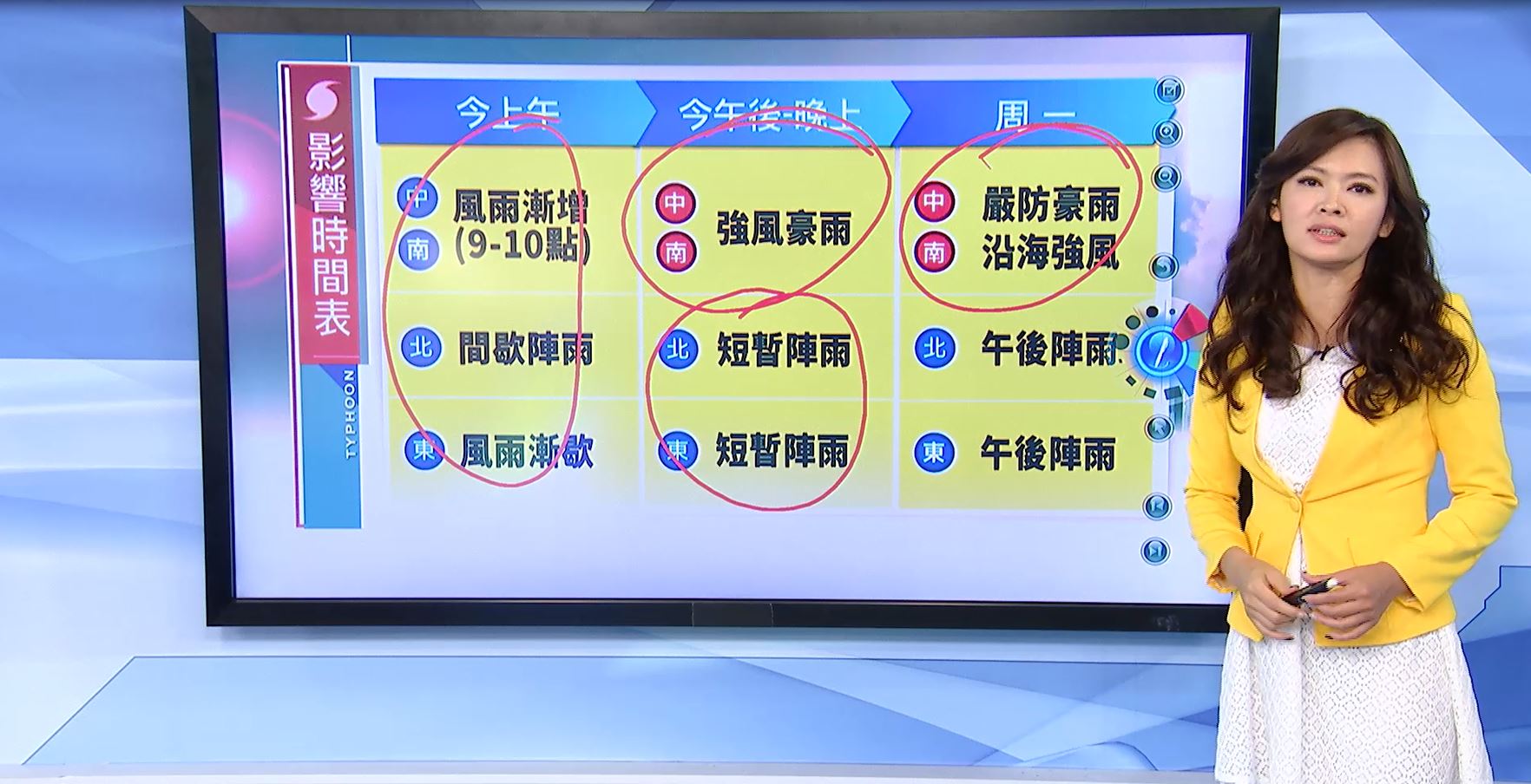 至於今天一整天的天氣概況,王淑麗指出,雖然太陽出來露了臉,東部和北部地區的降雨明顯趨緩,但部分地區仍有短暫陣雨,而且從今天下午海棠颱風來襲後,南部地區就開始有強風豪雨的現象,並從晚上一直持續到明天(31日)清晨,嘉義以南包括台南、高雄、屏東這幾個縣市都必須多加戒備。