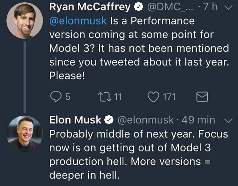 既然Model 3的級距對手是BMW 3-Series、Mercedes-Benz C-Class、Audi A4與Lexus IS等競品,Tesla當然也很清楚在這個級距之中,一定有性能車的銷售潛力;為此,Tesla總裁Elon Musk近日親自在社交軟體上透露,將於2018年中推出Model 3的進階性能車型。