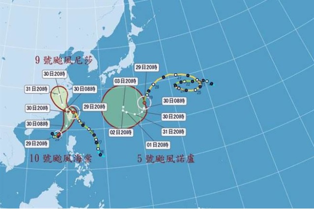 尼莎、海棠撲台後已陸續離開台灣,不過21日就已生成的第5號颱風「諾盧」至今仍在西北太平洋上,今(1日)已邁入第12天,不僅很長命,未來有機會增強為強颱,持續朝日本前進。雖然10號颱風海棠已經減弱成熱低壓,但這已是相隔50年以來,再度出現編號相差5號的颱風同時並存。