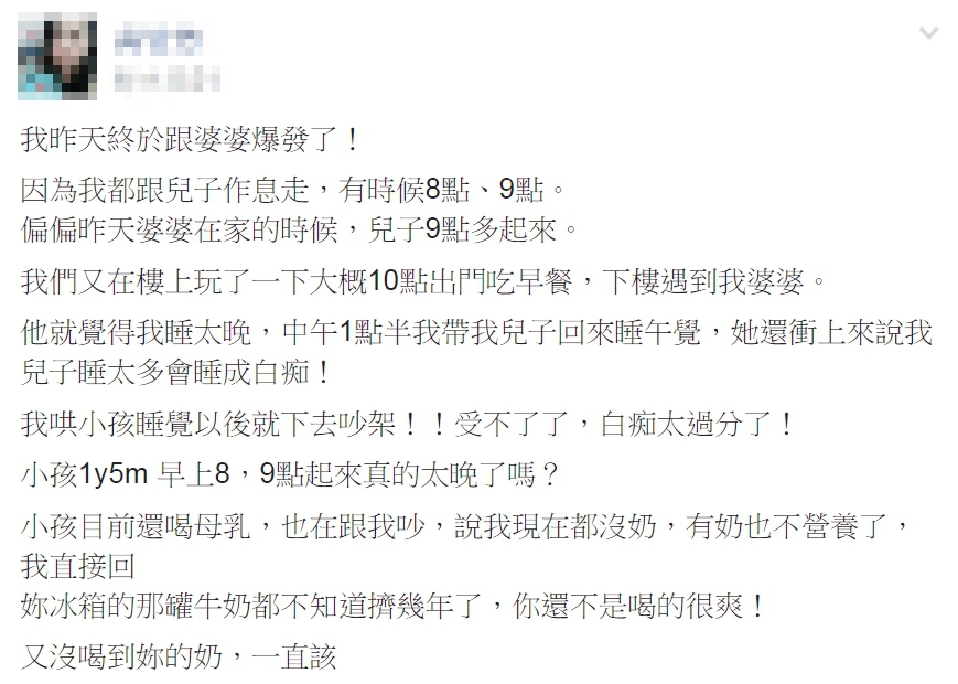 婆婆10點才看到兩人出現,認為媳婦睡太晚了,於是媳婦中午1點半帶兒子回家睡午覺時,就衝上樓大罵「兒子睡太多會睡成白痴!」這讓媳婦忍無可忍,於是把小孩哄到睡著之後,便下樓和婆婆吵架,「受不了了,白痴太過分了!小孩1y5m,早上8、9點起來真的太晚了嗎?」