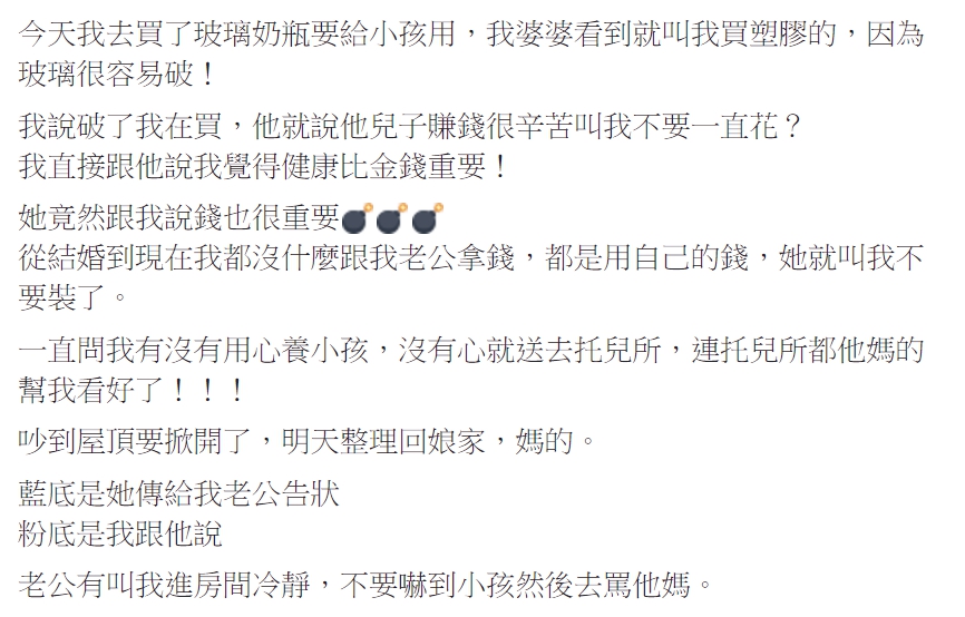 而到了昨天(2日),婆婆看到媳婦買玻璃奶瓶給小孩,又嫌玻璃很容易破且兒子賺錢很辛苦,要媳婦「不要一直花」,買塑膠奶瓶就好,媳婦聽了表示健康比金錢重要,沒想到婆婆竟說「錢也很重要」,還暗指她都花老公的錢、沒用心養小孩。