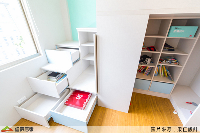▲方便置物、拿取的層板與抽屜,更適合讓孩子學習整理、條理。(圖/信義居家/果仁設計)