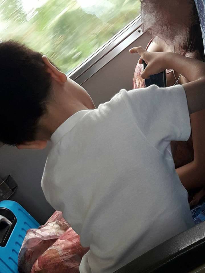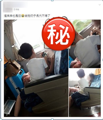 一名網友在臉書「爆廢公社」PO出3張照片,並寫道:「偷拍奶子,長大不得了」。從照片中可以看到,一名身穿低胸洋裝的辣妹坐在靠窗位子熟睡,但坐在隔壁男童卻持手機,在女子的胸前不停「猛按螢幕」,根據《ETNEWS》報導,原PO指出:「當時時間在早上9點到10點之間,往高雄的自強號上」、「弟弟原本就坐在那,和女乘客互相並不認識」,所以無法理解男童的動機。