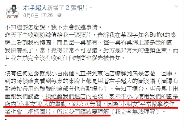 創立四年,由兩名插畫家共同經營且擁有10萬粉絲的「右手超人」粉絲專頁,日前被告知插畫作品被一間知名連鎖Buffet盜用,且出現在店內每張餐桌上,兩人得知後直接到店詢問,店長竟以「工讀生私人行為」為由,辯稱與公司無關,且只同意付