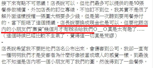 原先決定息事寧人的他們,在聽到這句話後瞬間「理智斷線」。小白詢問店長是否能以「圖像授權」的方式處理,「我們從七月用到現在的圖像授權費這樣,不然我們的圖平白無故被用了,還用在所有桌上(最少60桌),老實說覺得很吃虧。」店長聽到後,表示僅能提供「10張餐券做補償,外加店長的訂位專線,不怕訂不到位。」