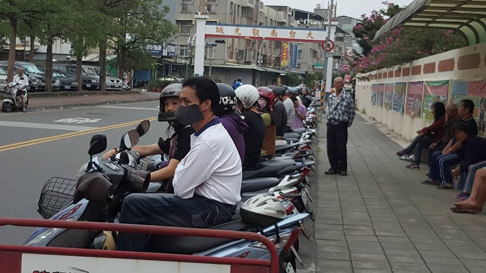 只見這些家長們非常有秩序,一致性的車頭朝外,看上去少說也有10幾20輛機車,每輛車整齊劃一地排列著,此外,照片右方還可以看到,沒有騎車的家長,則是守秩序地坐在牆邊規劃好的等待區,這樣的畫面看起來讓人感覺很平靜卻也震撼。
