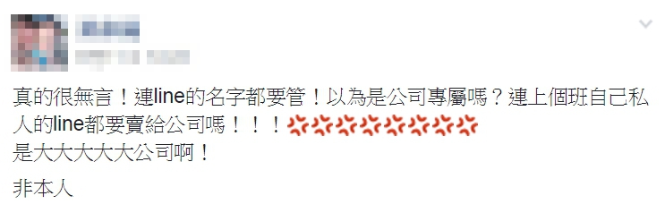 而這張對話被網友PO上臉書《爆怨公社》,他說「真的很無言!連LINE的名字都要管!以為是公司專屬嗎?連上個班自己私人的LINE都要賣給公司嗎!是大大大大大公司啊!」