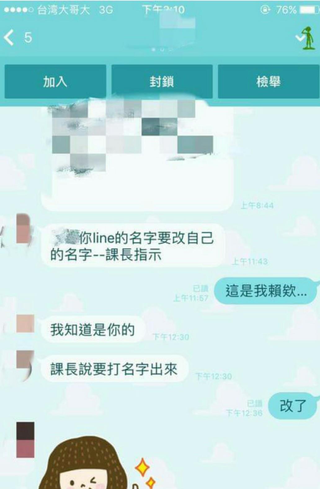 一名公司員工將LINE對話截圖,只見疑似是主管的人傳訊息來,要他把LINE的名字改成自己的姓名,並強調是「課長指示」,而員工看了之後,覺得這是是私人帳號,公司干涉到員工自由,於是回說「這是我的賴(LINE)欸…」,沒想到對方說「我知道是你的」,卻又再強調「課長說要打名字出來」,讓這名員工好無奈改為本名。