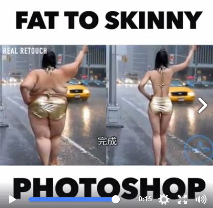 相較於這個拙劣的修圖,另一名網友的技巧顯然高明許多。這支修圖影片被PO在FB上,畫面中有個肥胖的女子,穿著清涼衣物,舉手招計程車。經過修圖,原本她粗壯的雙腿、腰間的肥肉,以及垂掛在手臂的蝴蝶袖全都消失,變成一位體態玲瓏的女子,雖然修很大,但一旁的街景卻看不出明顯痕跡,非常厲害。