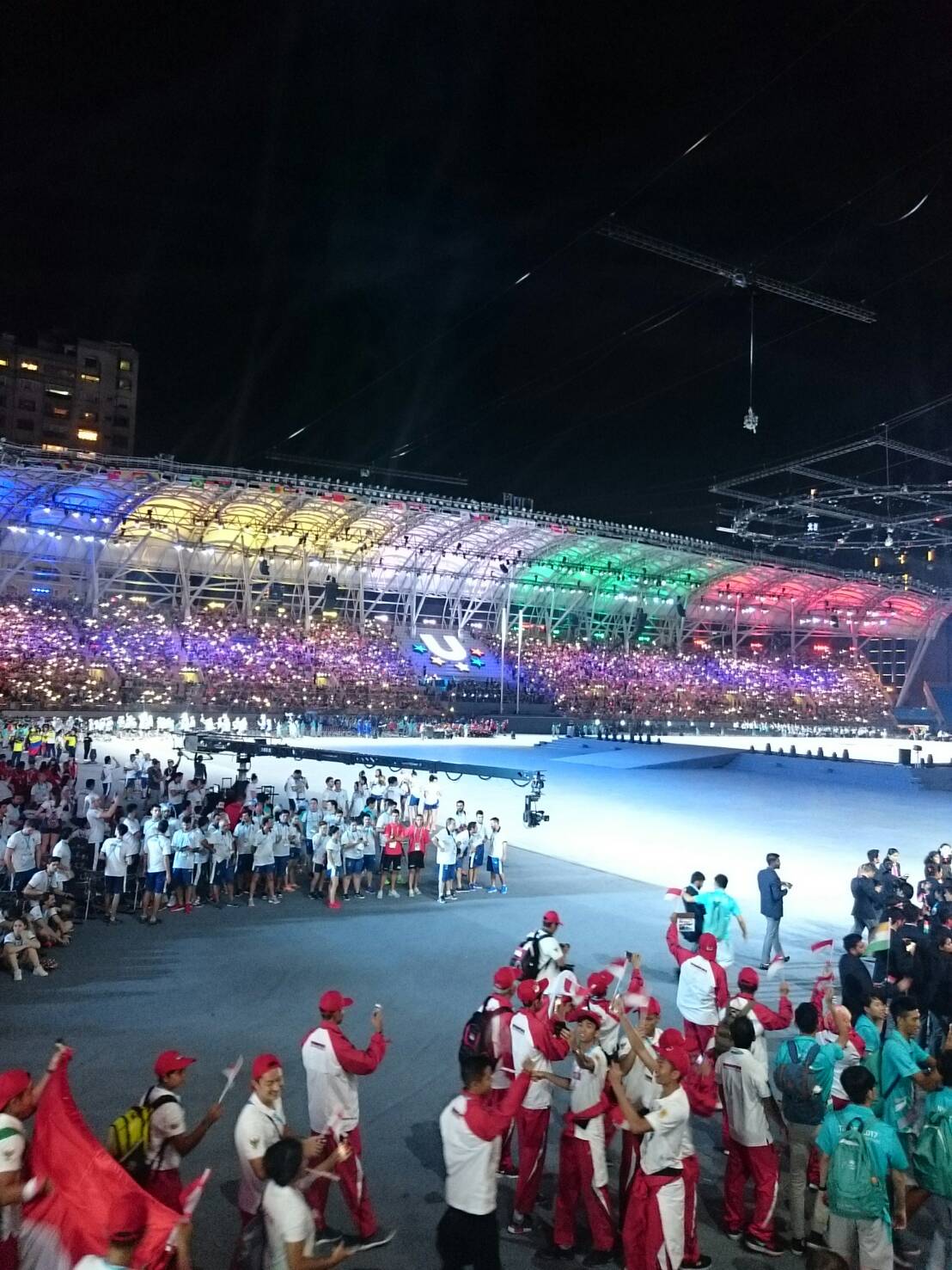 進場動線的走道旁邊,突然有人丟擲煙霧彈,距離選手相當近,現場一片混亂,瀰漫起藍色煙霧,在運動員集合的小巨蛋門口,呼喊口號、鳴汽笛,甚至想衝入場館、拍打窗戶。導致選手們延遲半個小時才陸續進場,選手入場受阻的畫面已傳至全世界,事發當時,會場還傳出有外媒大喊「shame on you! I want see students(你好丟臉!我要看學生)」,讓場面十分尷尬,網友看到這樣的畫面也直呼好像「喪屍」。。