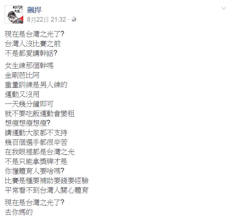 我國好手郭婞淳日前以抓舉107、挺舉142、總和249公斤的成績拿下金牌,不僅打破大會紀錄一舉奪金,還在挺舉打破了世界紀錄,成為台灣之光,讓大家看了都好感動。但館長當時卻PO文痛斥,平常台灣人對體育漠不關心,「幾百個選手都很辛苦,在我眼裡都是台灣之光,不是只能拿獎牌才是。」