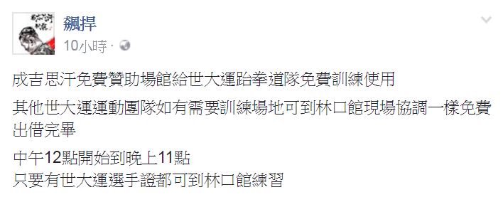 才剛祭出一陣砲轟,館長就用行動力挺世大運,昨天在臉書表示,要免費贊助場館給世大運跆拳道隊訓練使用,而其他世大運運動團隊如有需要訓練場地,也可以到場協調,同樣是免費出借,因為館長的健身房就開在林口選手村對面,「只要有世大運選手證都可到林口館練習」。