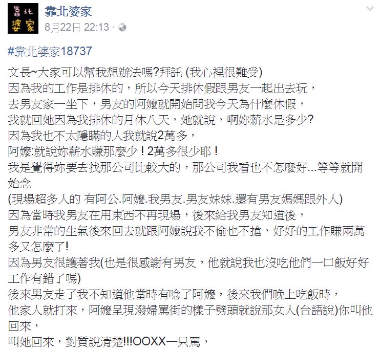 一名女網友在臉書《靠北婆家》發文表示,自己平時工作月休八天是採排休的方式,所以就在22日的平日時間和男友一起出去玩,之後又到男友家裡去坐坐。才剛到家裡一坐下來,男友的阿嬤就急著問原PO薪水多少,原PO心想沒必要隱瞞,所以就誠實地回答說2萬多。