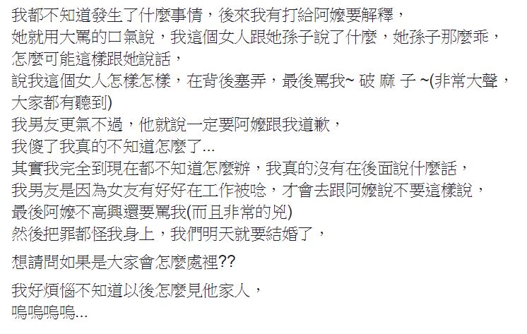 事後原PO表示,「我真的沒有在後面說什麼話,我男友是因為女友有好好在工作被唸,才會去跟阿嬤說不要這樣說」,沒想到卻惹得阿嬤不高興,把罪都怪在原PO身上。而他們本來預計在和男友家人起衝突的隔天就要結婚了,現在則不知該如何是好。