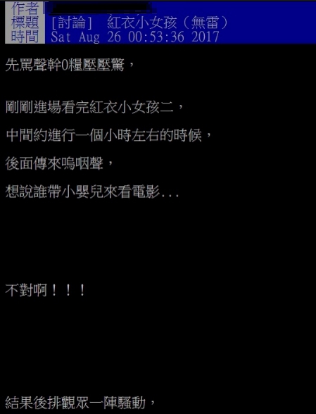 有網友在「批踢踢實業坊」的電影看板發文,表示自己剛進場看完《紅衣小女孩2》,但電影播到一小左右時,突然聽見身後傳來嗚咽聲,當時原PO心想誰會帶小嬰兒來看電影。不過,事情卻在稍後出現變化,原PO發現後排的觀眾傳出騷動,這才發現竟是一位小女孩疑似出現「中邪」狀況,她的眼睛一直