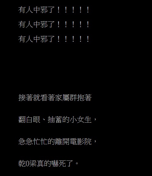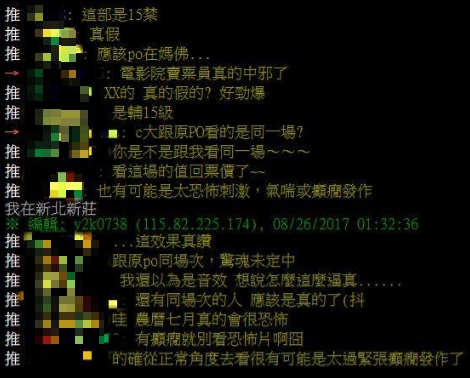 這一幕情景帶給原PO許多衝擊,原PO直呼三字經幫忙壓驚。不少網友在看完此篇PO文後,紛紛留言,「農曆七月真的會很恐怖」、「好可怕」,也有人認為事件太過離奇,質疑它的真實性,不過隨即有人出來證實,「跟原po同場次,驚魂未定中」、「我還以為是音效,想說怎麼這麼逼真」。不過也有網友推測,女童可能本身有氣喘或