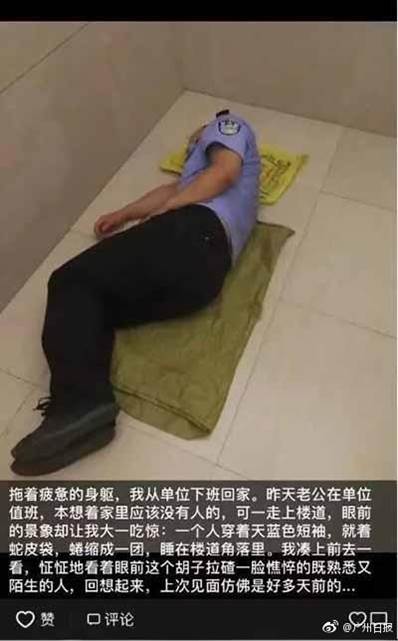 這一天早晨8點多,顧源紅下完班拖著疲憊的身軀,才剛走到家門口前,竟看到一位穿著天藍色短袖的男人,蜷縮著身體睡在家門口,仔細一看竟是自己的枕邊人,驚訝大過於驚嚇的顧源紅,輕輕叫醒了這位留著一臉憔悴,留著鬍渣,既熟悉又陌生的丈夫,問道「你昨天不是值班嗎,怎麼跑回來了?還有為什麼好好的家裡不睡,要睡在家門口走廊上?」