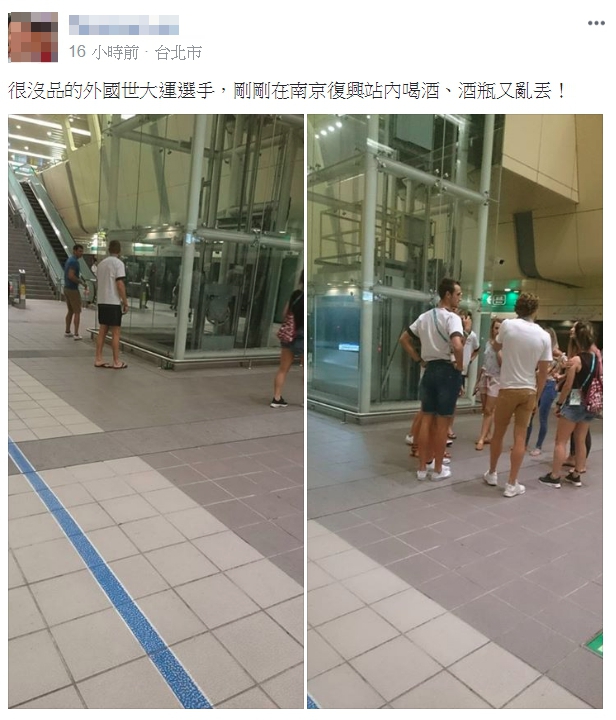 網友看到幾名在捷運中的外國人,其中一位的身後疑似掛著世大運的識別證,另一位則高舉酒瓶,讓網友拍下後批評表示「很沒品的外國世大運選手,剛剛在南京復興站內喝酒、酒瓶又亂丟!」