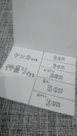 情侶之間想要增加感情,會怎麼做呢?一名日本人夫「るるる」在推特上PO炫耀文,指出「老婆送給我一份很棒的禮物」,並PO上禮物的照片,照片中只見一只信封袋還有一張寫著「SPECIAL TICKET」的紙,打開一看竟是5張「愛的啪啪券(Sex)券」和1張「和好券」及,使用期限為2018年8月24日。對此,原PO表示,很開心能搏君一笑,同時這一次的生日也讓他難忘。