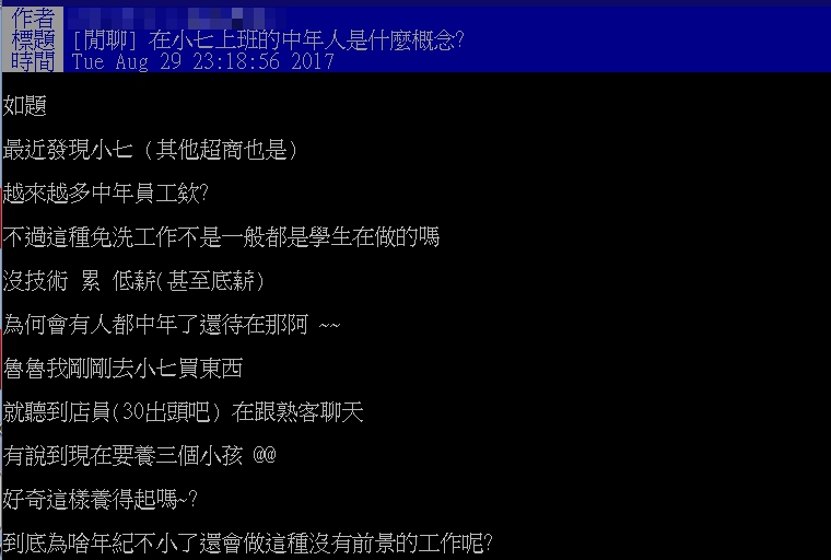 一名女網友以「在小七上班的中年人是什麼概念」為題發文表示,最近發現超商中越來越多已經步入中年的員工,她認為超商的工作除了累之外,還非常低薪,且幾乎都是學生打工在做的,她對此感到非常困惑,無法理解他們的選擇。
