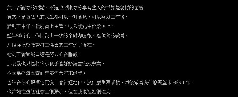 這名女網友反問原PO,是否曾有過清晨5、6點就出門工作,到深夜11、12點才收工的生活,並表示,自己的媽媽就是如此辛苦。而之所以已經中年還做他人眼裡所謂打工性質的工作,是因為年輕時的工作遇上金融海嘯,遭無預警裁員,並非無緣無故或不努力而做打工性質的工作。而她如此拼命都只是為了養家、讓兒女不用因為經濟問題而影響到課業。