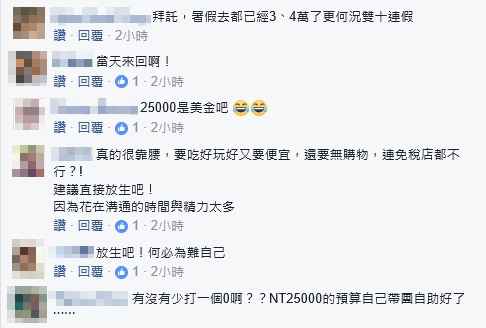 光是坐商務艙就可能破3字頭了,更何況要壓在25000以內?有人網友表示,「坐華航的子公司虎航,外加住五星級員工開的民宿,再吃路邊攤,我想25000元也不夠吧」,還有人直接建議,「這種客人若你再不放生,就是自找麻煩了」、「這個不能接!根本是賠錢做生意」、「蓋茅屋的預算,想要有住別墅的享受」,甚至有人開玩笑說,請他們家族旅遊直接留在台灣北海岸就好!