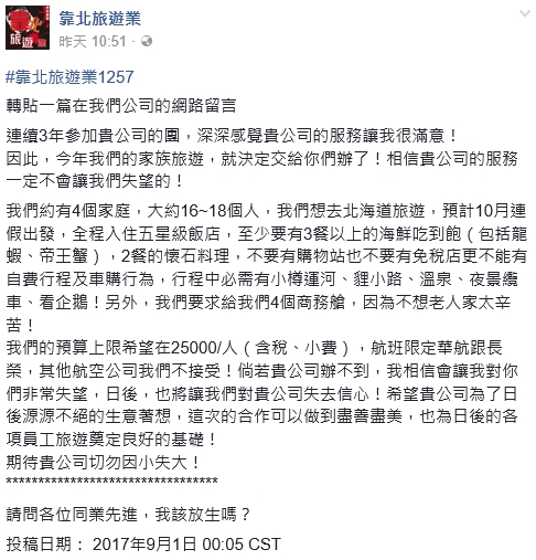 自稱常客的網友表示,這次的家族旅行包括4個家庭,人數約16至18人,地點指名北海道,預計在今年10月連假高峰期出發,並註明「全程入住五星級飯店」,且至少有3餐以上的海鮮吃到飽,食材包括龍蝦、帝王蟹等,以及2餐的懷石料理;另外提及行程裡不要出現購物站、免稅店,其他自費行程和車購行為,一定要有景點「小樽運河、貍小路、溫泉、夜景纜車、看企鵝」,再加4個商務艙,原因是不想要老人家太辛苦。