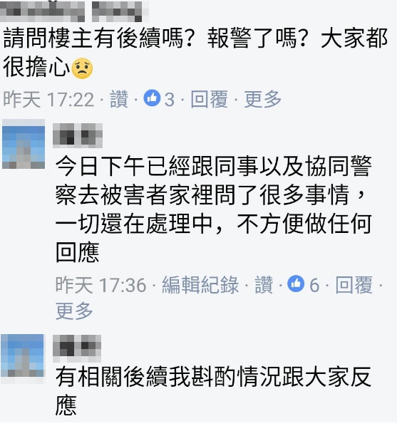 另外也有網友關心目前女國中生的狀況如何,對此原PO回應表示,已經跟同事向警方報案,警察也有到女國中生家裡做進一步的釐清,目前一切還在處理中,有相關後續會再斟酌向大家回覆。