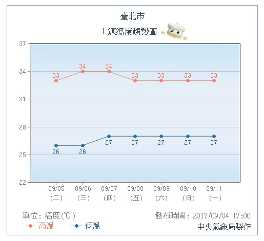 氣象局表示,明起到至周四除了東部及恆春半島以外,其他地區大多為多雲到晴,午後有局部短暫雷陣雨,降雨區域以各地山區及北台灣靠近山區平地為主。溫度部分,各地恢復為悶熱的天氣型態,高溫約32至34℃,另清晨至上午間中南部沿海地帶由於海陸風效應,有零星短暫陣雨發生的機率。