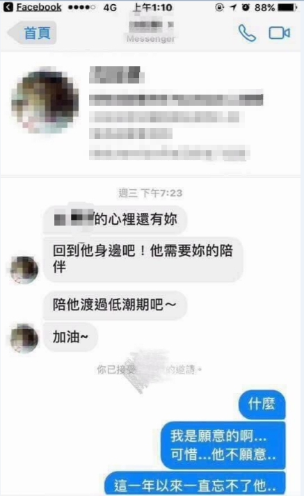 女網友在臉書《爆怨公社》社團表示,自己日前收到前男友友人的訊息,得知前男友心裡一直還有她,前男友友人還對女網友說:「回到他身邊吧!他需要妳的陪伴」,並希望女網友能陪前男友度過低潮,女網友想得知前男友的狀況,但並未獲得正面回應。而女網友也坦承,自己雖然已經跟前男友
