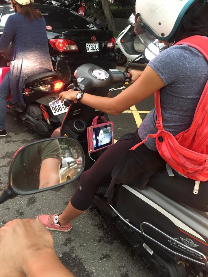 騎車時所見的「奇景」,照片中的這名女騎士為了追劇,竟然在機車龍頭下方的吊鉤上掛了一台平板電腦,還戴著耳機,低頭沉浸在戲劇之中,如此誇張的行徑讓網友PO文寫到:「姐今天追的不是劇,追的是車禍」,最後還在文中貼心提醒「綠燈了,該走了」。
