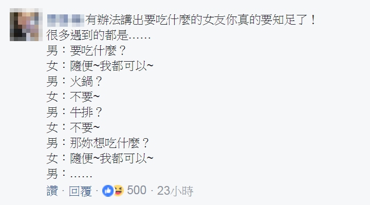 另外也有不少男網友表示,「有辦法講出要吃什麼的女友你真的要知足」、「這樣還不好唷?這麼好養」、「 吃火鍋有什麼好抱怨的,我都沒有女朋友陪我吃火鍋」、「如果真心那麼怨,你可能要考慮換女友了,因為冬天即將到來,女生有可能3餐都想吃火鍋…」