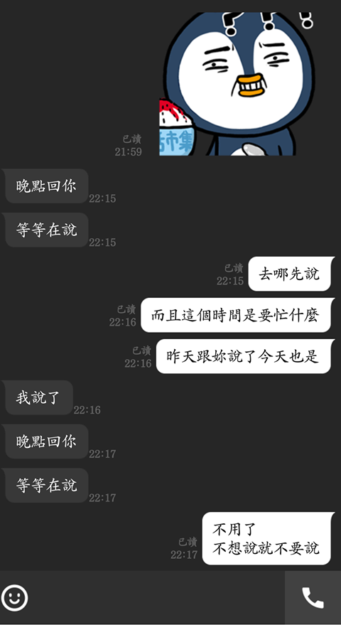 而這幾天女友在晚上10點多時又不見人影,原PO傳訊息問她在哪裡,但女友卻只回「晚點回你,等等再說。」這讓原PO看了除了無奈之外更加擔心,便告訴女友希望她去哪裡要先說,沒想到對方卻又回:「我說了,晚點回你,等等再說。」