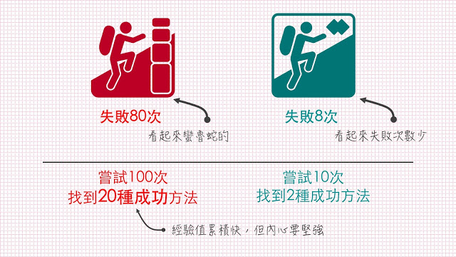 如果要嘗試100次,有80次的失敗,但可以找到20種成功的方法;其實要忍受80次的失敗,心裡一定會不太好過,如果選擇持續摸索,培養自己的堅韌性就是很重要的議題;若您問有沒有可能降低這80次的失敗機會?或者快速找到這20種方法?