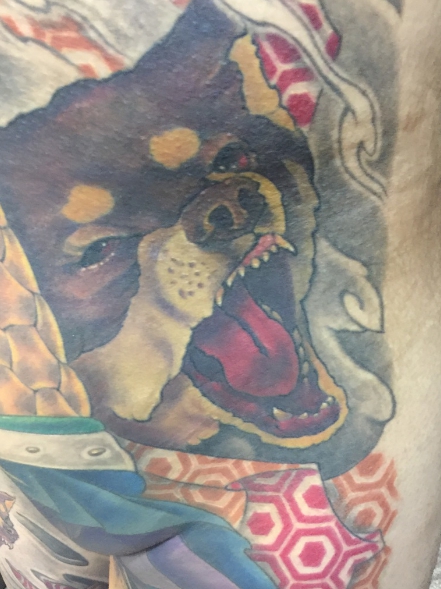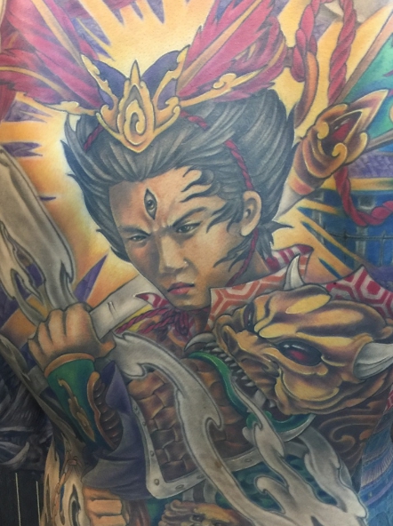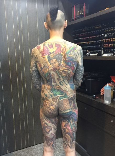 去年就有位25歲的型男許博迪,為了紀念愛犬小黑陪伴他走出喪兄之痛,決定去找曾昱傑在背部刺上「二郎神與嘯天犬」,曾昱傑考量許博迪190公分,身材高大、肩膀較寬,呈現倒三角形狀,為他量身訂做了一款刺青樣式,上半身是有羽毛頭飾跟戰化鎧甲的二郎神圖,下半身則是一隻嘯天犬配上5隻一般犬隻,形成強烈對比,加上許博迪前臂刺的黑白撒旦和木乃伊圖案,整體看起來有氣勢又不失精緻。