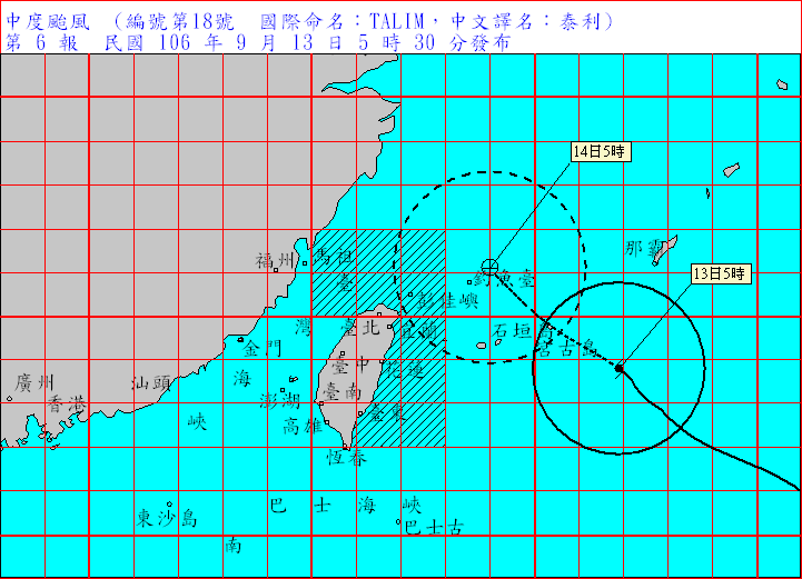 氣象局表示,今(13)日第18號中度颱風泰利清晨5時中心位置在台北東南東方約560公里的海面上,以每小時16公里的速度往西北移動,暴風圈已進入臺灣東方海面,對台灣東半部海面及台灣北部海面構成威脅。