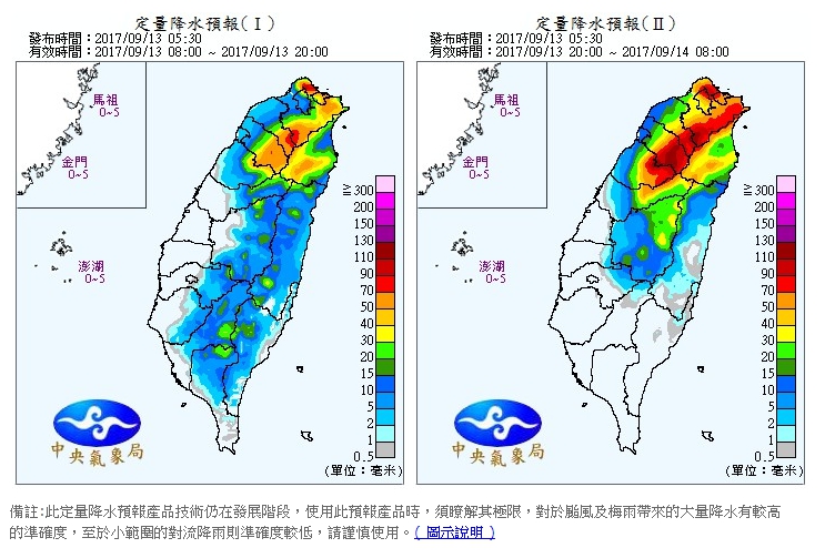 而影響最明顯的時間預計是在今天下半天到明天(14日)上半天這段時間,北部及東北部地區雨量預計仍將達到「豪雨」等級以上,其他地區也有大雨或豪雨發生的機率;風力部分,北部及東北部地區仍有進入七級風暴風圈的機率,因此不排除會有較強陣風出現,請大家多留意颱風的最新動態,並且做好防颱的準備工作。