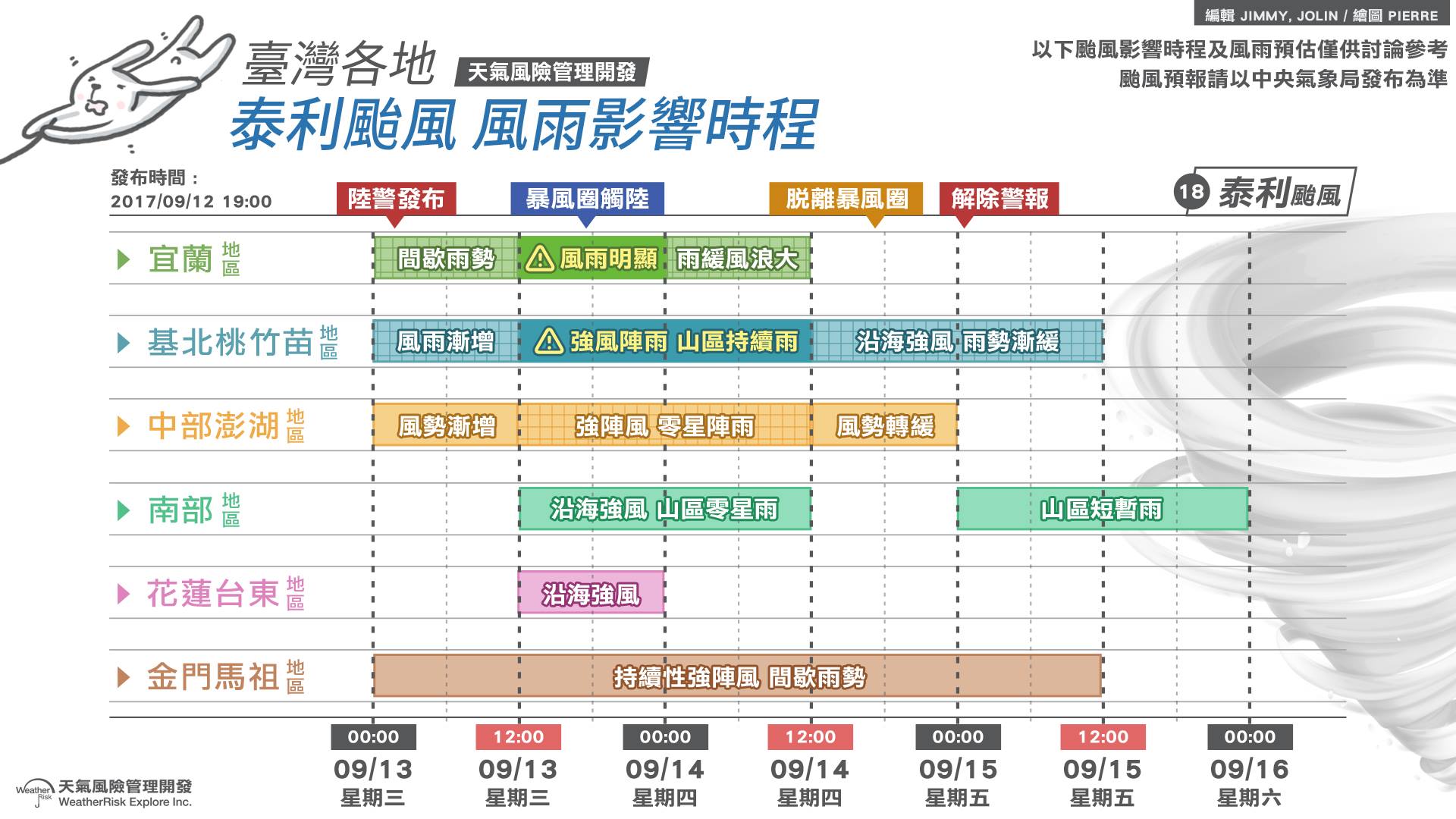 而《WeatherRisk天氣風險》也在臉書上貼出一張泰利颱風影響時程表,宜蘭地區13日至14日凌晨會有明顯風雨;北北基、桃竹苗地區則須注意強風陣雨、山區也會有持續降雨情形發生;台中以南及南投等地區則要注意零星陣雨;至於花蓮、台東、離島地區則須注意強風。