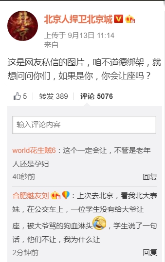▼網友PO文問看到孕婦、老人會不會讓座(圖/翻攝北京人捍衛北京城微博 下同)