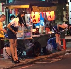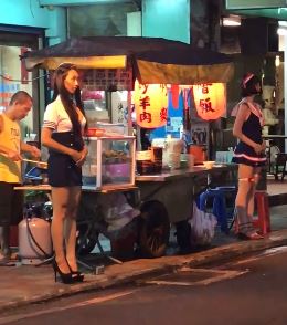 這樣詭異的畫面就在台北市六條通的巷弄內,附近酒店餐廳不少,這個攤販平時只有一對夫妻,從傍晚擺攤到凌晨,12日這天卻多了兩名女子,搞得路過的民眾都不自覺起雞皮疙瘩。