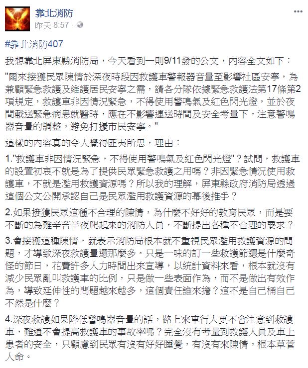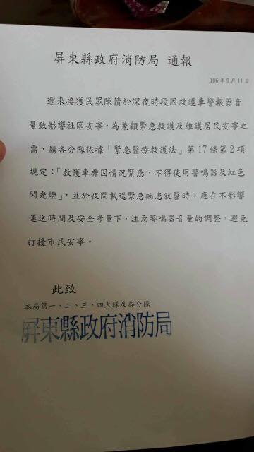 一名網友在臉書《靠北消防》貼出屏東縣消防局的一張公文,內容寫著近期接獲民眾陳情,說深夜時段因救護車警報器音量,導致社區安寧被影響,要求各分隊要依照《緊急救護法》第17條第2項規定,除非是遇到緊急情況,其餘「不得使用蜂鳴器及紅色閃光燈」;夜間載送緊急病患就醫時,也要注意警鳴器音量,避免打擾市民安寧。