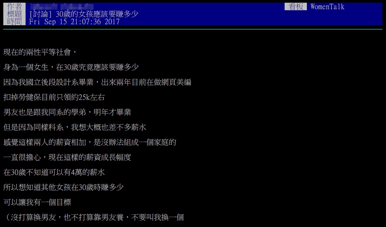 PTT上PO文表示,自己與男友目前月領25K左右,憂心這樣的薪水在日後無法組成一個家庭,於是詢問網友「30歲的女孩應該要賺多少?」