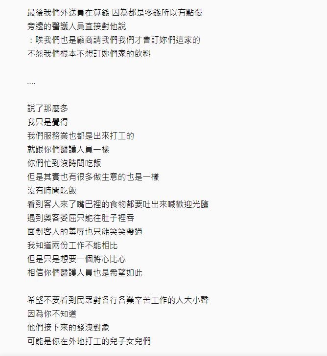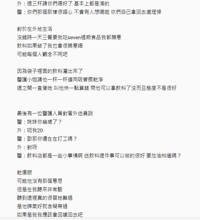 此外,醫護小姐還要求外送員要把所有飲料及吸管通通擦乾淨,且不斷催促問「可以拿飲料了沒」,還要外送員快點結算金額,但由於對方給的都是零錢,所以花了比較多時間計算,旁邊的醫護人員等不下去直接對著外送員說,「唉,我們也是廠商請我們我們才會訂妳們這家的,不然我們根本不想訂妳們家的飲料。」整個過程中醫護人員態度都不是很好,最後還有一名醫護人員對著外送員直接問年齡、打工等問題,甚至撂下一句「飲料店都是一些小事情啊,送飲料這件事可以做的很好,要加油知道嗎?」外送人員一聽,只好默默地吞下委屈。