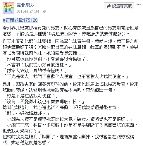 分手時,女方就曾在網路控前男友妹妹問她「妳是不是在佔我哥便宜?」,更直言「妳是不是手腳斷了?連自己吃的東西,也要我哥幫妳付?」,讓她當場理智線斷裂,但在場的前男友卻是坐在一旁悶不吭聲,讓她耿耿於懷,導致留下疙瘩,分手後又發文「自從遇到現任以後,才知道以前的我,多麽不幸福」,表示和現任外出吃飯時,對方都會請客,不像前男友斤斤計較。