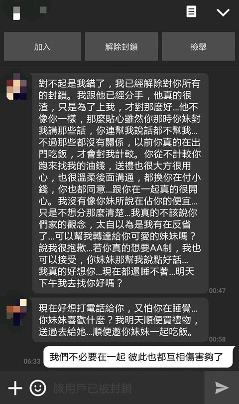 渣男」,才想起原PO過去對她的好,回頭挽回原PO「他不像你一樣,那麼貼心」,表示現任只是為了她的肉體才對她好,根本不是真心,還一一細數起原PO的好處「你從不計較你跑來找我的油錢,送禮也很大方,跟你在一起真的很開心」,坦承是自已太自以為是,已經有在反省,還說「我真的好想你...現在都還睡不著...明天下午我去找你好嗎?」,但原PO看完後只是淡淡地回應一句「我們不必要在一起,彼此也都互相傷害夠了」,便毅然決然地把女方封鎖。